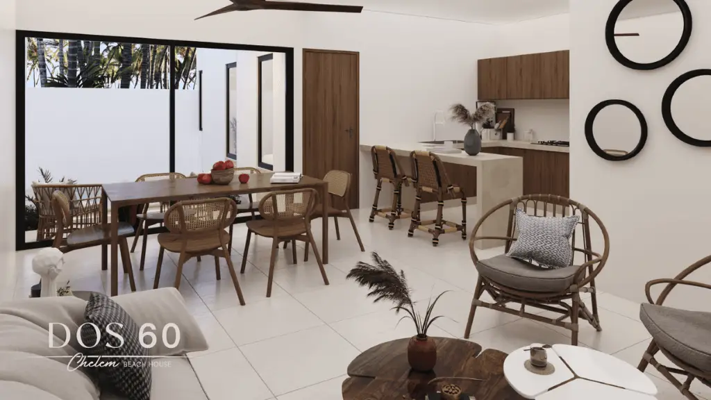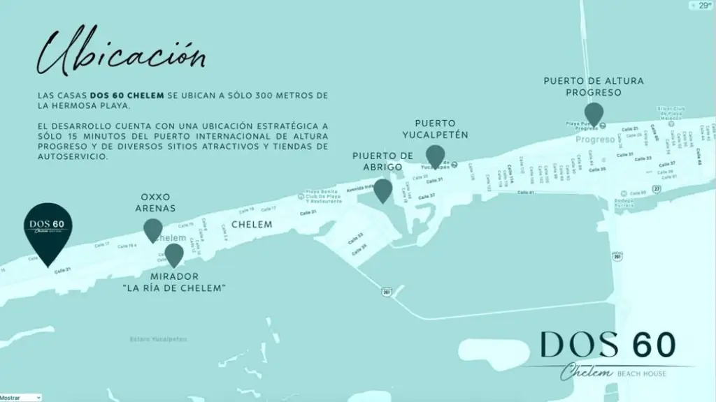 Las casas DOS 60 Chelem se ubican a sólo 300 metros de la hermosa playa. El desarrollo cuenta con una ubicación estratégica a solo 15 minutos del puerto internacional de altura Progreso y de diversos atractivos y tiendas de autoservicio.