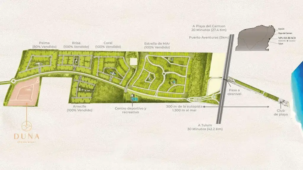 XPU-HA BEACH es un complejo turístico – residencial ubicado a 20 minutos del centro de Playa del Carmen y a 30 minutos de Tulum. Su ubicación privilegiada te permitirá disfrutar de la privacidad de la selva y la alegría del mar con los beneficios de las ciudades cercanas. DUNA está ubicado dentro del complejo conocido como XPU-HA BEACH.